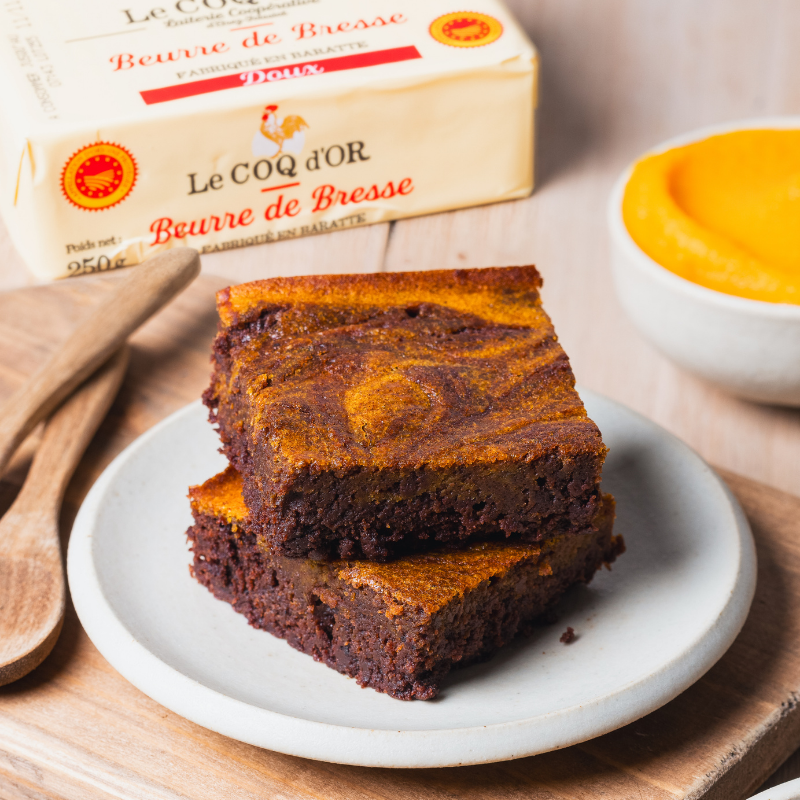 • Couler la préparation à la citrouille par-dessus, étaler pour recouvrir le brownie, puis créer des marbrures à l’aide de la pointe d’un couteau.