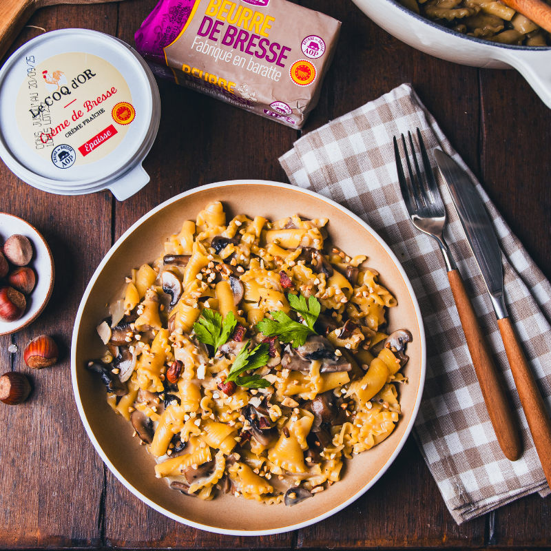 • Hors du feu, ajouter la crème de Bresse AOP, mélanger et rectifier l’assaisonnement si besoin.