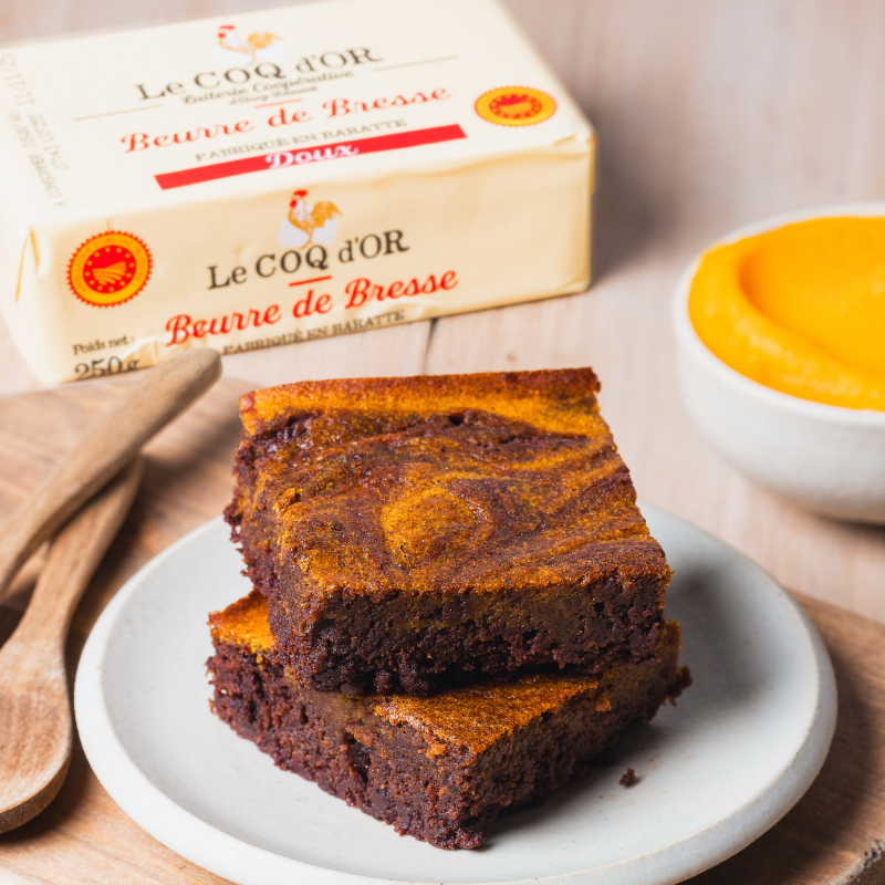 • Couler la préparation à la citrouille par-dessus, étaler pour recouvrir le brownie, puis créer des marbrures à l’aide de la pointe d’un couteau.